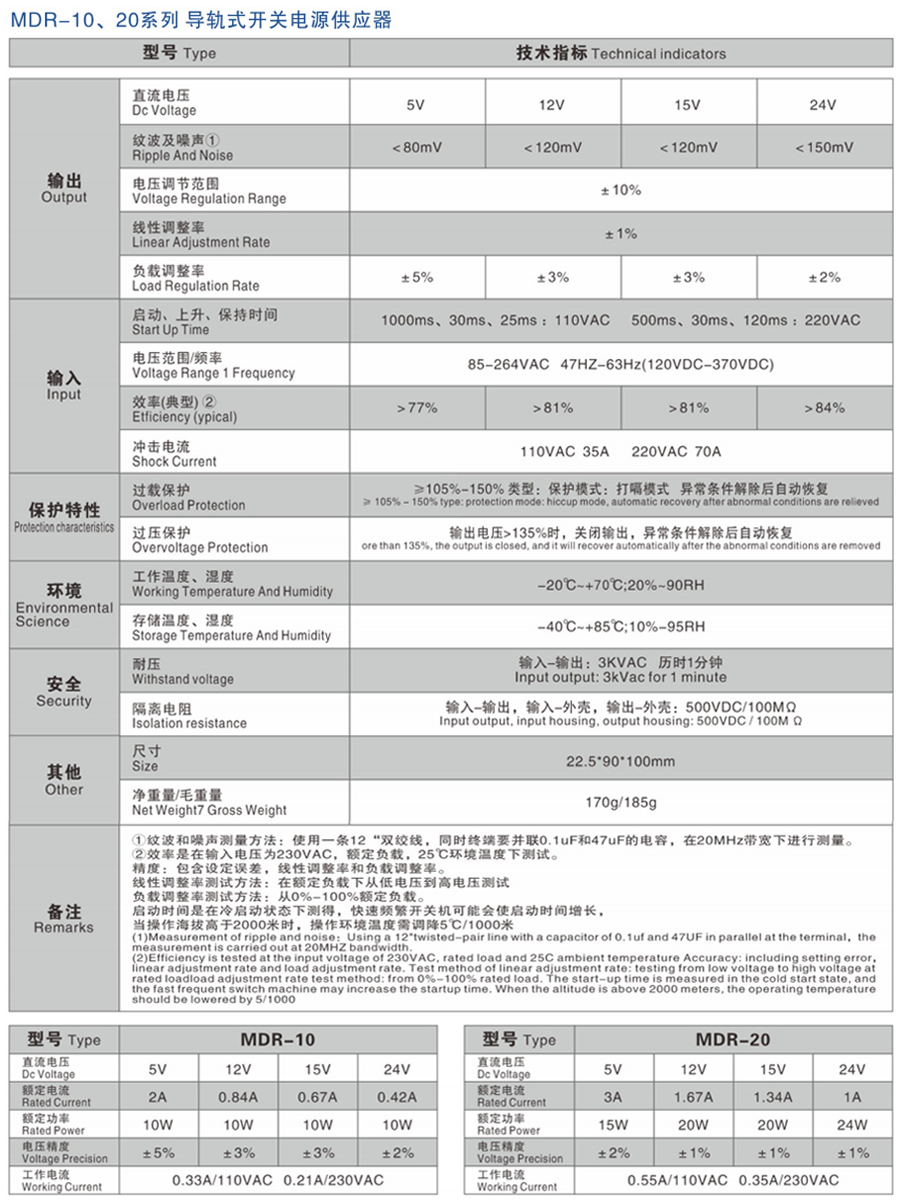 MDR-10、20、40、60、100系列是一款10、20、40、60、100單組輸出封閉型電源供應器,采用85 -264VAC全范圍交流輸入整系列提供5V, 12V, 15V, 24V, 36V和48V輸出。除了效率高達91.5%,金屬網外殼智能風扇設計加強了散熱能力使MDR-10、20、40、60、100在沒有風扇的情況下工作在-30°C到+70°C的溫度范圍內,能使終端系統很容易滿足國際能源要求。MDR-10、20、40、60、100有完整的保護功能和抗5G振動能力;它符合TUV EN60950-1, EN60335-1,EN61558-1/-2-16, UL60950-1和GB4943國際安全法規,MDR-10、20、40、60、100系列為各種工業應用提供了一個高性價比的解決方案。