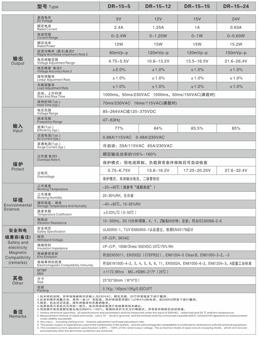 DR-15系列是一款15W單組輸出封閉型電源供應器,采用85-264VAC全范圍交流輸入,整系列提供5V, 12V, 15V, 24V, 36V和48V輸出。除了效率高達91.5%,金屬網外殼的設計加強了散熱能力使DR-15在沒有風扇的情況下工作在-30C到+70°C的溫度范圍內。能使終端系統很容易滿足國際能源要求。DR-15有完整的保護功能;它符合TUVEN60950-1, EN60335-1, EN61558-1/-2-16, UL60950- 1和GB4943國際安全法規,DR-15系列為各種工業應用提供了一個高性價比的解決案。