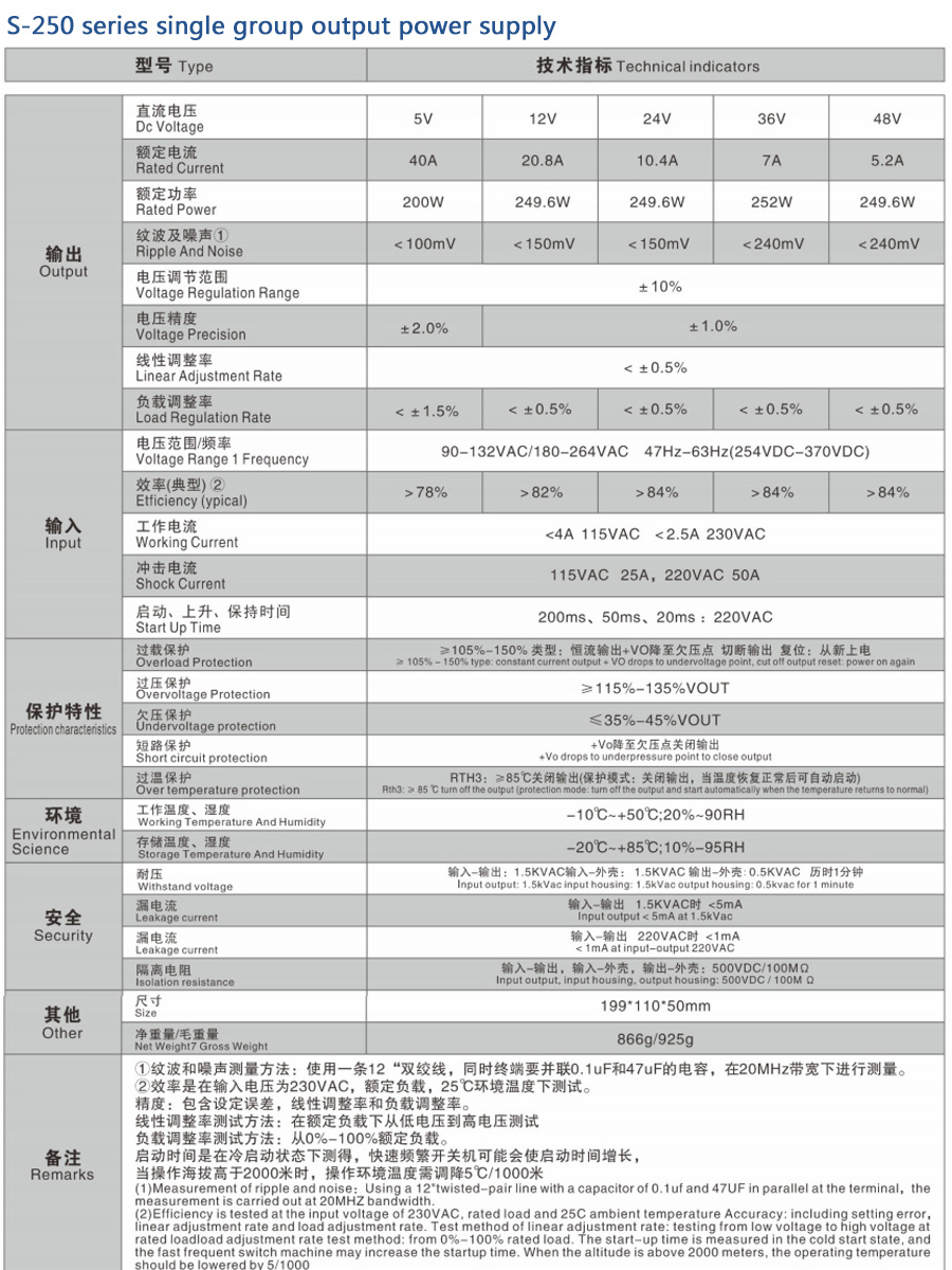 S-250 series is a 250 single group output enclosed power supply, which adopts 85-264VAC full range AC input, and the whole series provides 5V, 12V, 15V, 24V, 36V and 48V output. In addition to the high efficiency of 91.5%, the design of smart fan with metal mesh enclosure enhances the heat dissipation capability, making the S-201 work more stably in harsh environments, and making the terminal system easily meet international energy requirements. S-250 has complete protection function; It complies with TUV EN60950-1, EN60335-1, EN61558-1/- 2-16, UL60950-1 and GB4943 international safety regulations. S-250 series provides a cost-effective solution for various industrial applications.