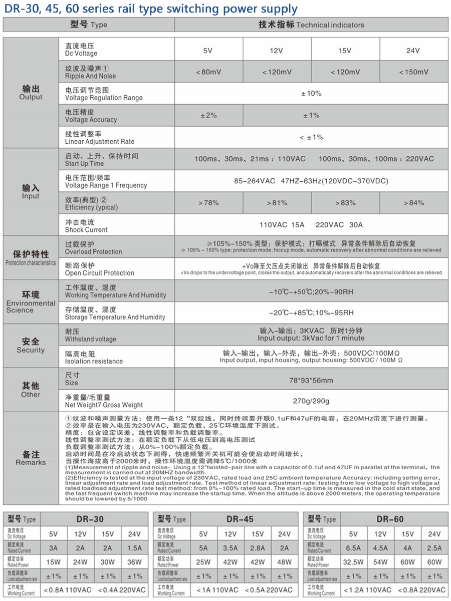 DR-30, 45, 60 series are a 30, 45, 60W single group output enclosed power supply, which uses 85 - 264VAC full range AC input to provide 5V, 12V, 15V, 24V, 36V and 48V output. In addition to the high efficiency of 91.5%, the design of intelligent fan with metal mesh enclosure has enhanced the heat dissipation capacity, so that DR-30, 45, 60 can work in the temperature range of - 30 ° C to+70 ° C without a fan. The terminal system can easily meet international energy requirements. DR-30, 45 and 60 have complete protection functions; It complies with TUV EN60950-1, EN60335-1, EN61558-1/- 2-16, UL60950-1 and GB4943 international safety regulations. DR-30, 45 and 60 series provide a cost-effective solution for various industrial applications.