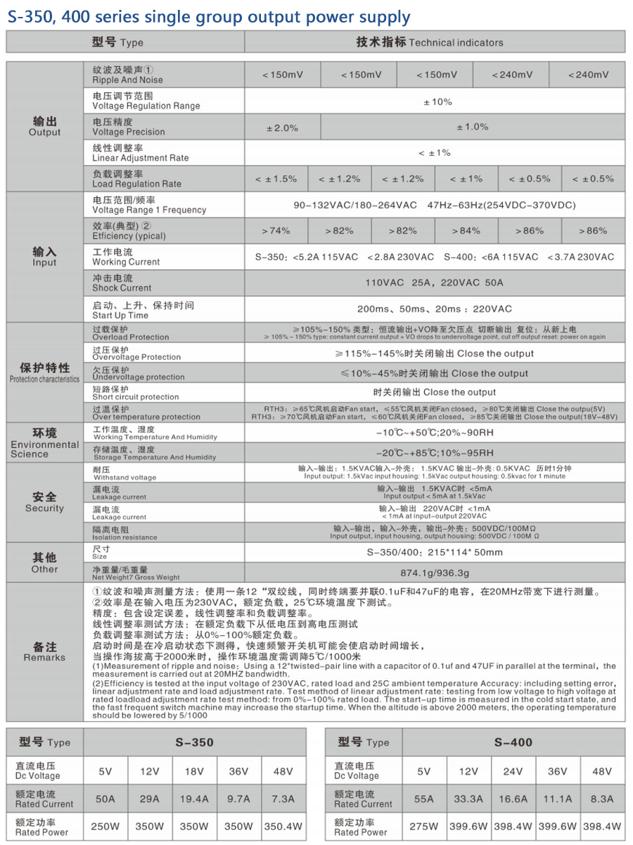 S-350, 400 series is a 350, 400 single group output enclosed power supply, which uses 85-264VAC full range AC input. The whole series provides 5V, 12V, 15V, 24V, 36V and 48V output. In addition to the high efficiency of 91.5%, the design of smart fan with metal mesh enclosure enhances the heat dissipation capability, making the S-201 work more stably in harsh environments, and making the terminal system easily meet international energy requirements. S-350 and 400 have complete protection functions; It complies with TUV EN60950-1, EN60335-1, EN61558-1/- 2-16, UL60950-1 and GB4943 international safety regulations. S-350 and 400 series provide a cost-effective solution for various industrial applications.