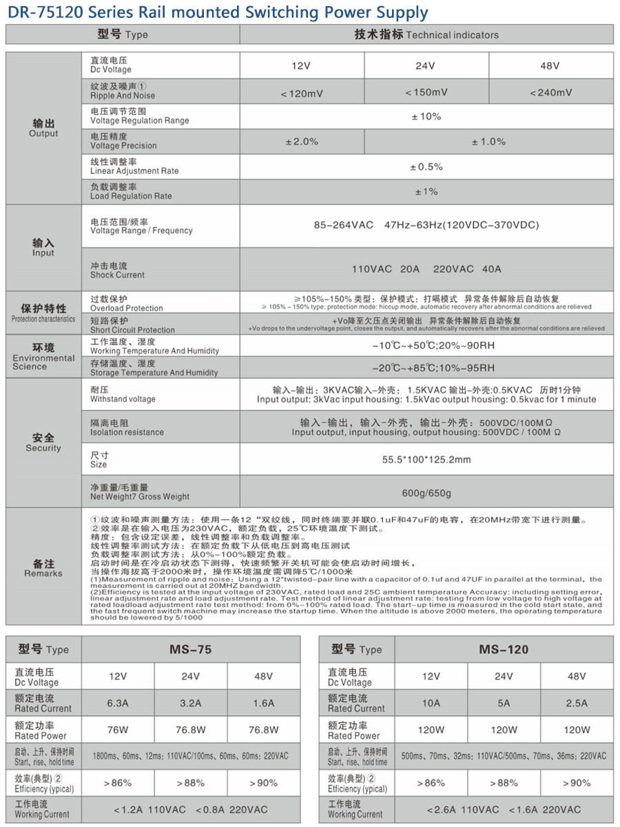 DR-120, 240, 480 series are 240, 480W single group output enclosed power supply, which use 85-264VAC full range AC input to provide 5V, 12V, 15V, 24V, 36V and 48V output. In addition to the efficiency of up to 91.5%, the design of smart fan with metal mesh enclosure enhances the heat dissipation capability, so that DR-120, 240, 480 can work in the temperature range of - 30C to+70 ° C without a fan. The terminal system can easily meet international energy requirements. The DR-120, 240 and 480 have complete protection functions; It complies with TUV EN60950-1, EN60335-1, EN61558-1/- 2-16, UL60950-1 and GB4943 international safety regulations. DR-120, 240 and 480 series provide a cost-effective solution for various industrial applications.