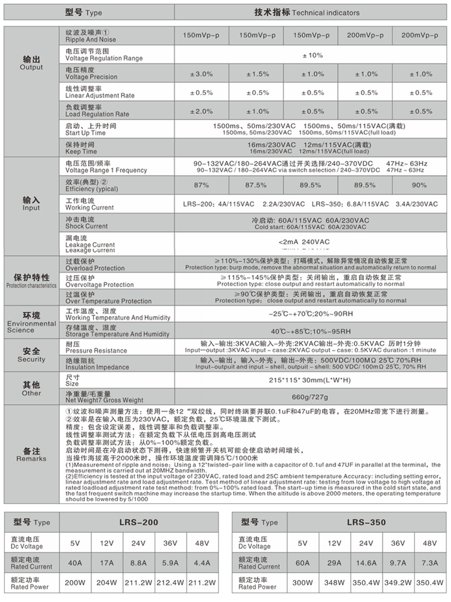 LRS-200, 250 series are 200, 250 single group output enclosed power supply, with 30mm low profile design, 85-264VAC full range AC input, and the whole series provides 5V, 12V, 15V, 24V, 36V and 48V output. In addition to the efficiency of up to 91.5%, the design of the metal mesh enclosure has enhanced the heat dissipation capability to enable the LRS-200 to work in the temperature range of - 30C to+70C without fans. The terminal system can easily meet the international energy requirements by providing ultra-low no-load power consumption (less than 0.3W). LRS-200 and 250 have complete protection function and 5G vibration resistance; It complies with TUVEN60950-1, EN60335-1, EN61558 - 1/- 2-16, UL60950-1 and GB4943 international safety regulations. LRS-200 and 250 series provide a cost-effective solution for various industrial applications.